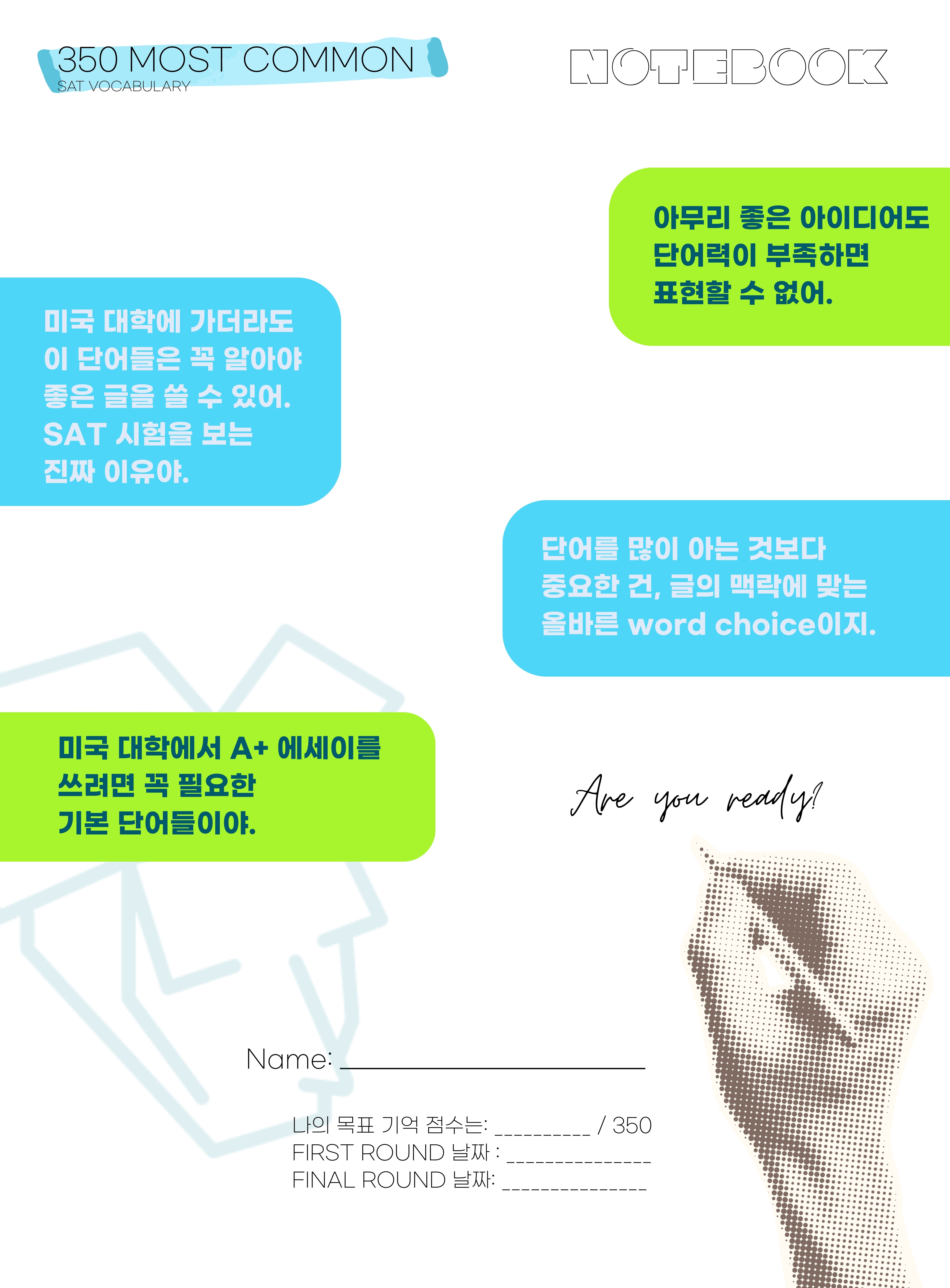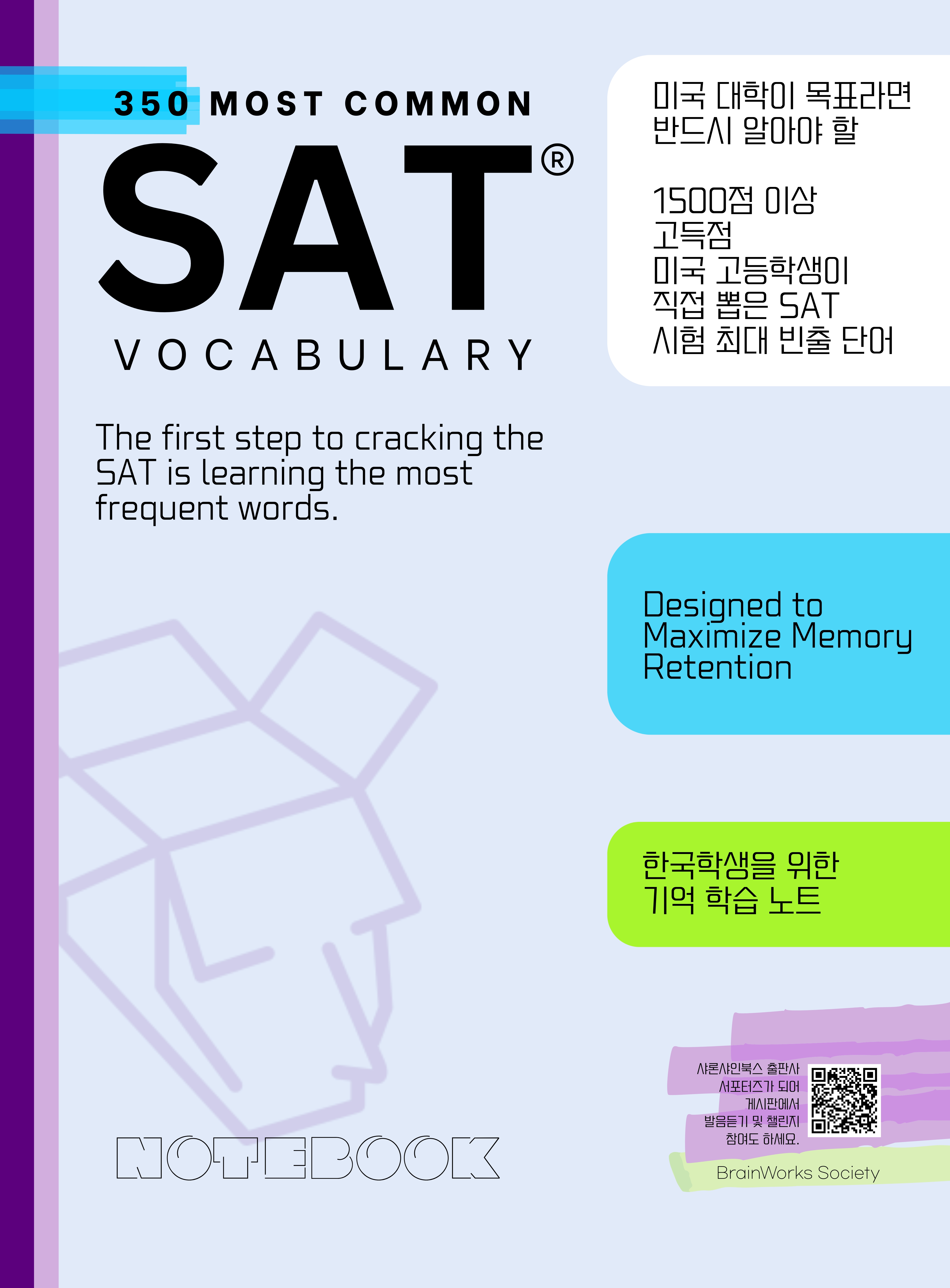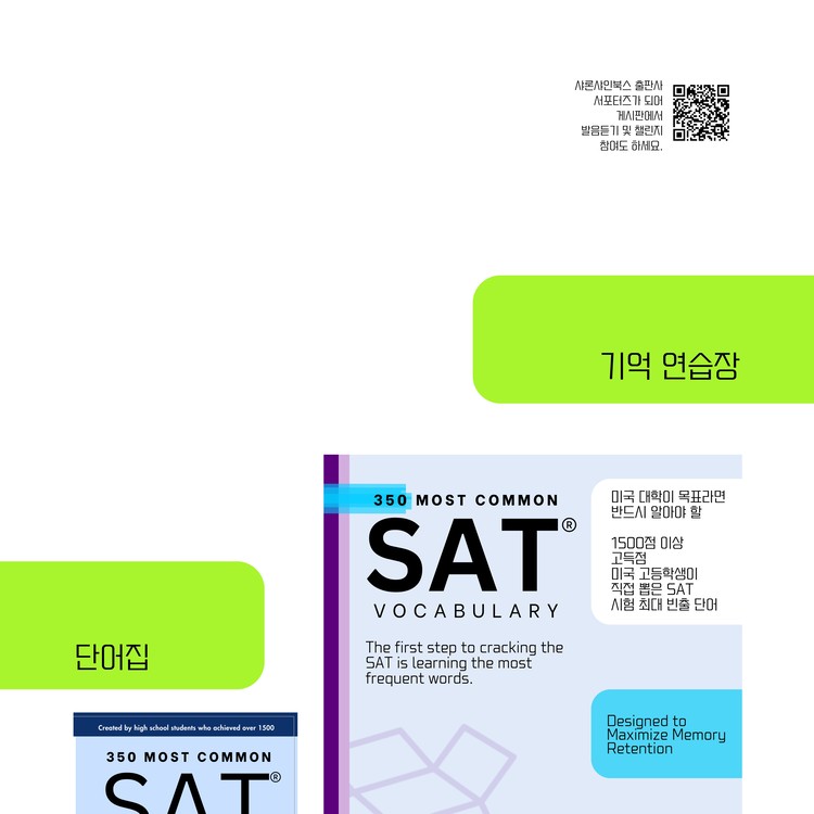 SAT 시험 중에 빈도수가 높은 350개를 미국, 캐나다 고등학생들과 합작으로 만들었습니다. 수익금은 전액, 글로벌 고등학생들의 글쓰기, 출판 활동, 작품 지원을 위해 쓰입니다.