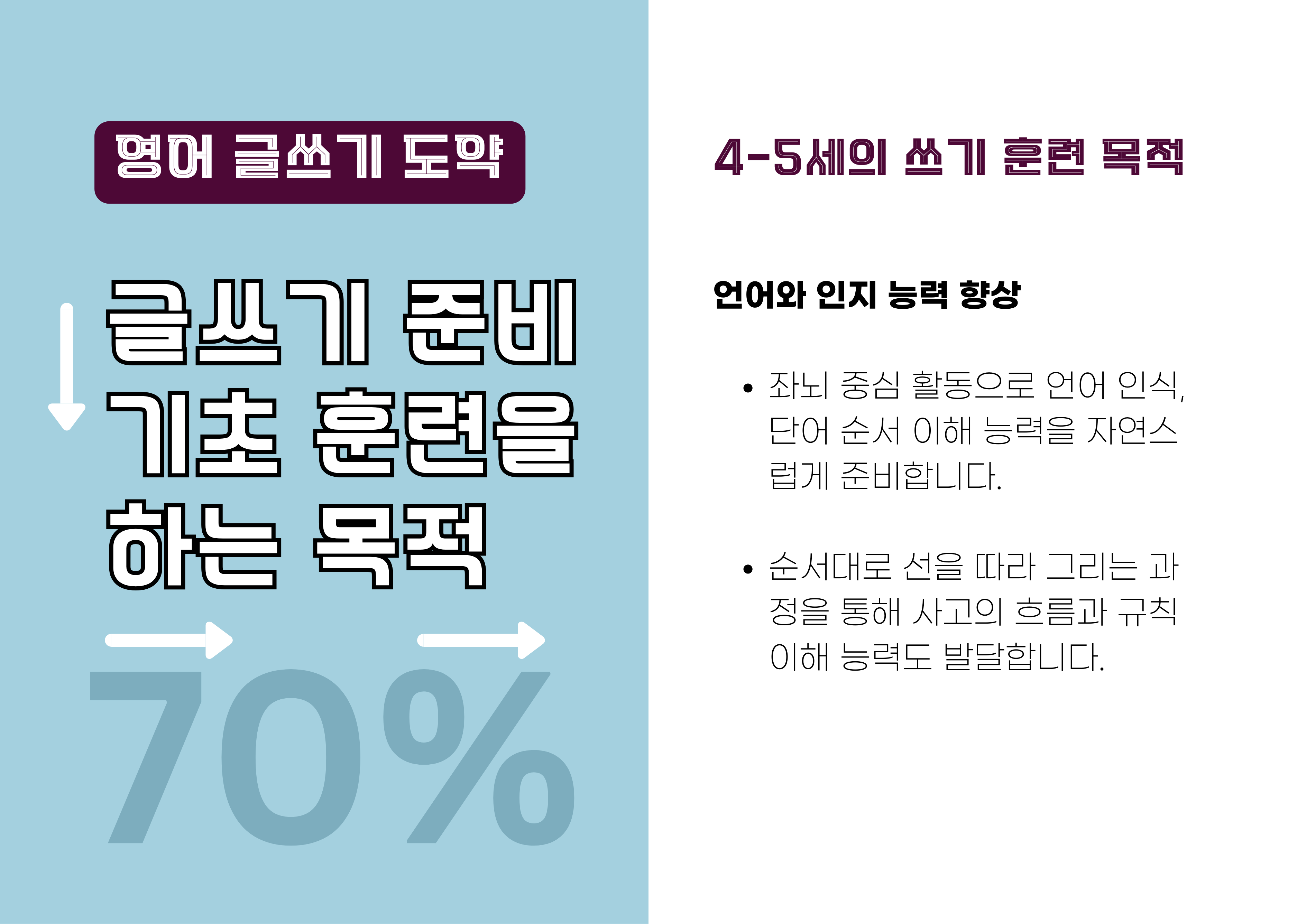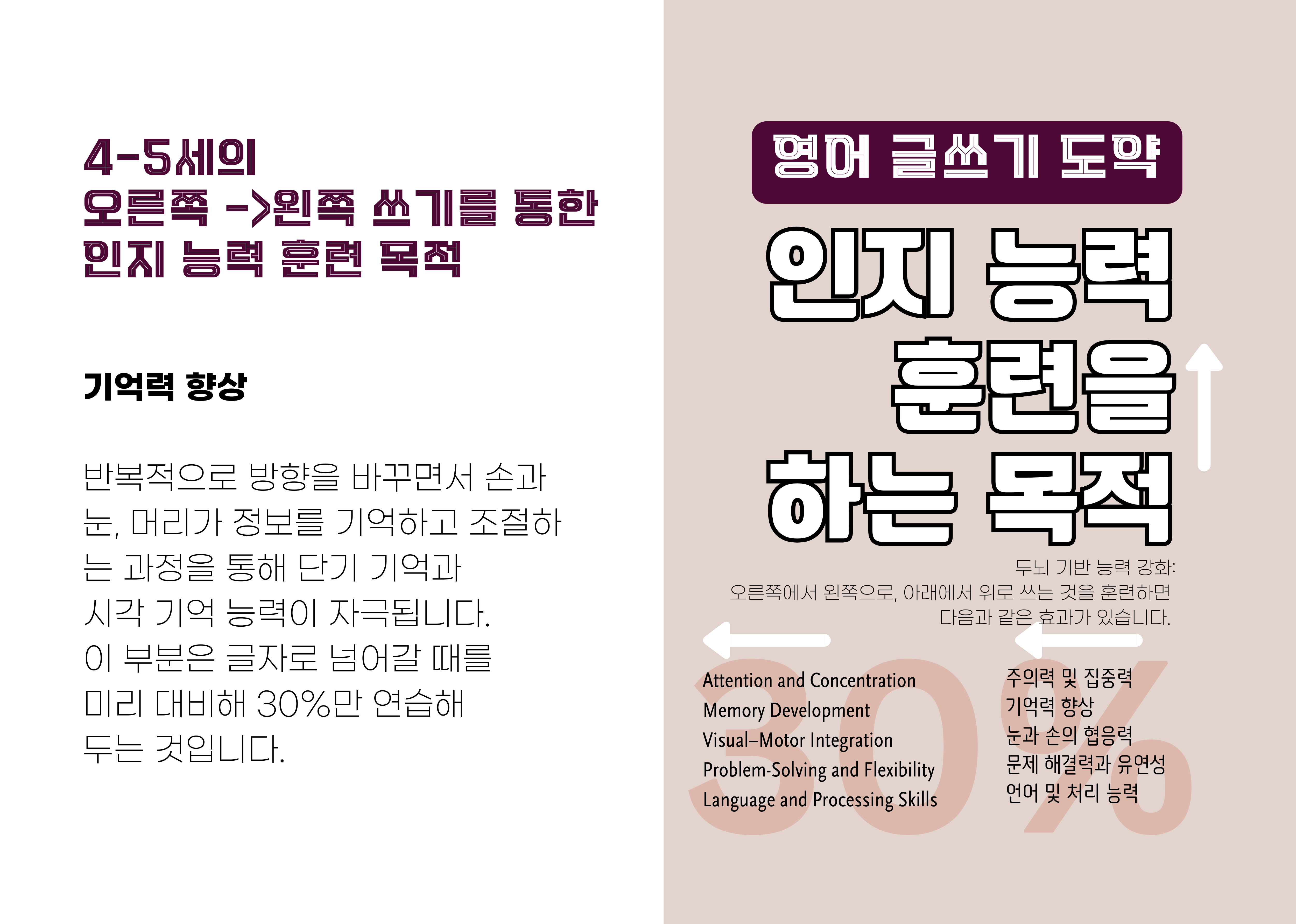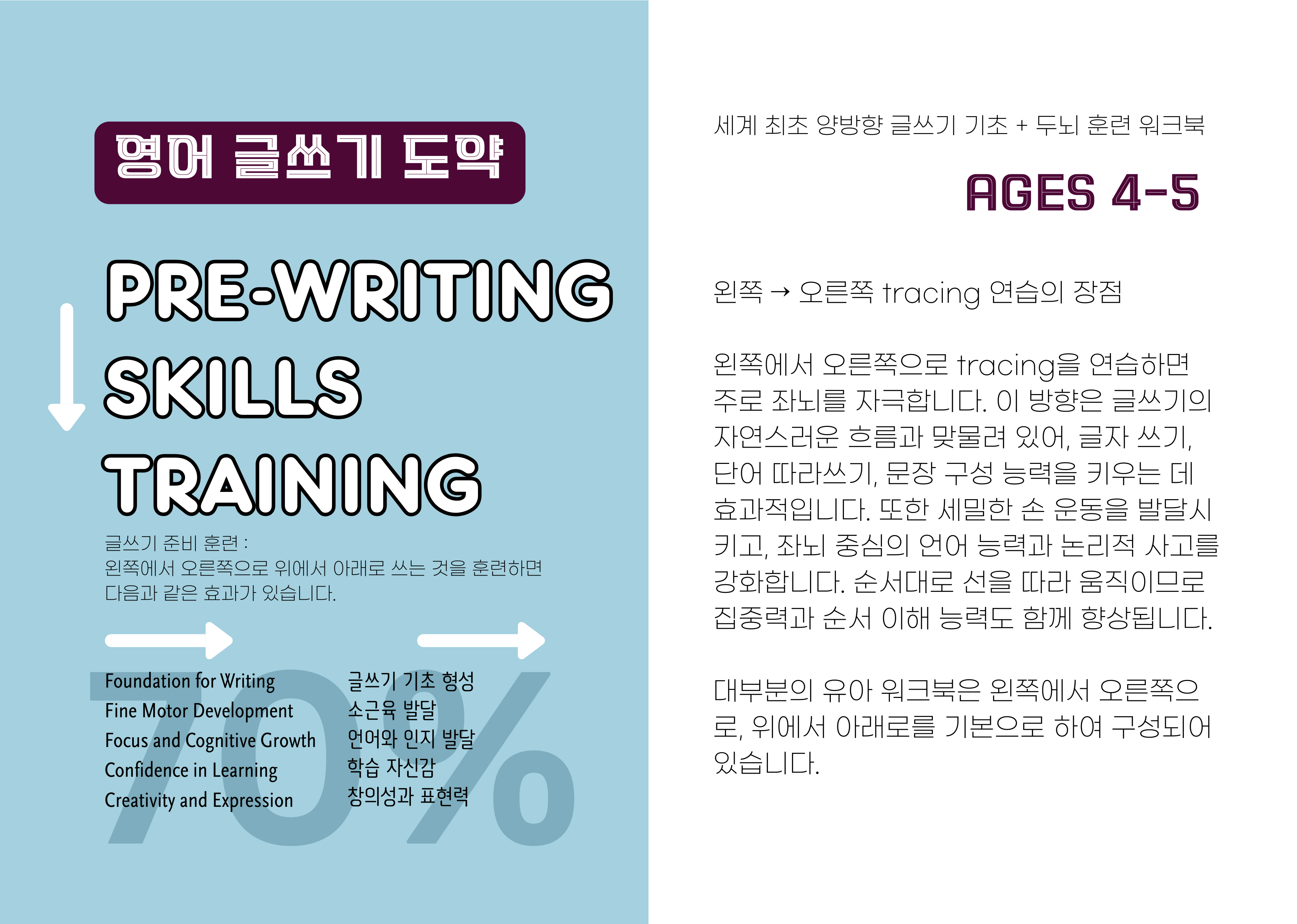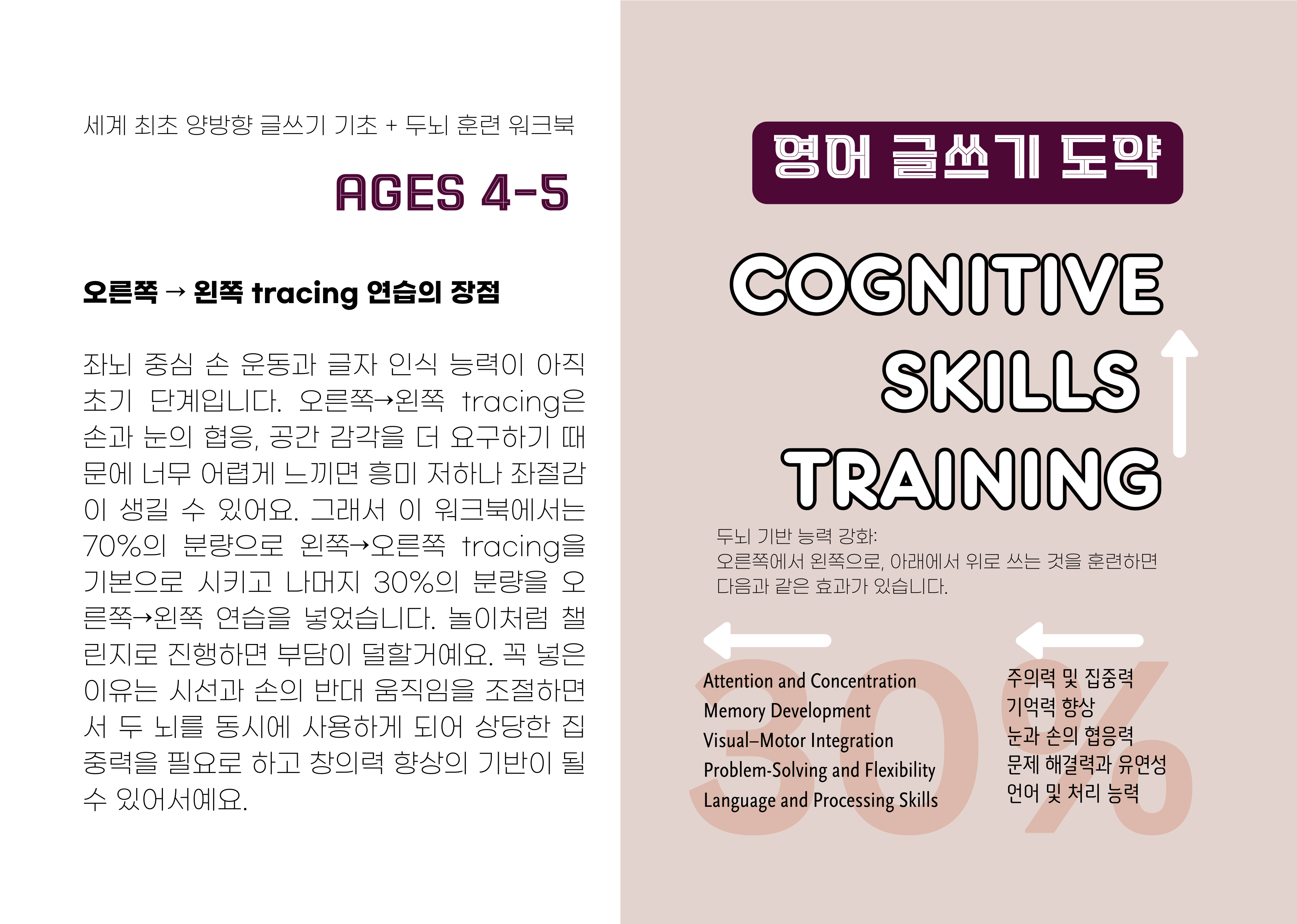 좌뇌 중심 손 운동과 글자 인식 능력이 아직 초기 단계입니다. 오른쪽→왼쪽 tracing은 손과 눈의 협응, 공간 감각을 더 요구하기 때문에 너무 어렵게 느끼면 흥미 저하나 좌절감이 생길 수 있어요. 그래서 이 워크북에서는 70%의 분량으로 왼쪽→오른쪽 tracing을 기본으로 시키고 나머지 30%의 분량을 오른쪽→왼쪽 연습을 넣었습니다. 놀이처럼 챌린지로 진행하면 부담이 덜할거예요. 꼭 넣은 이유는 시선과 손의 반대 움직임을 조절하면서 두 뇌를 동시에 사용하게 되어 상당한 집중력을 필요로 하고 창의력 향상의 기반이 될 수 있어서예요.