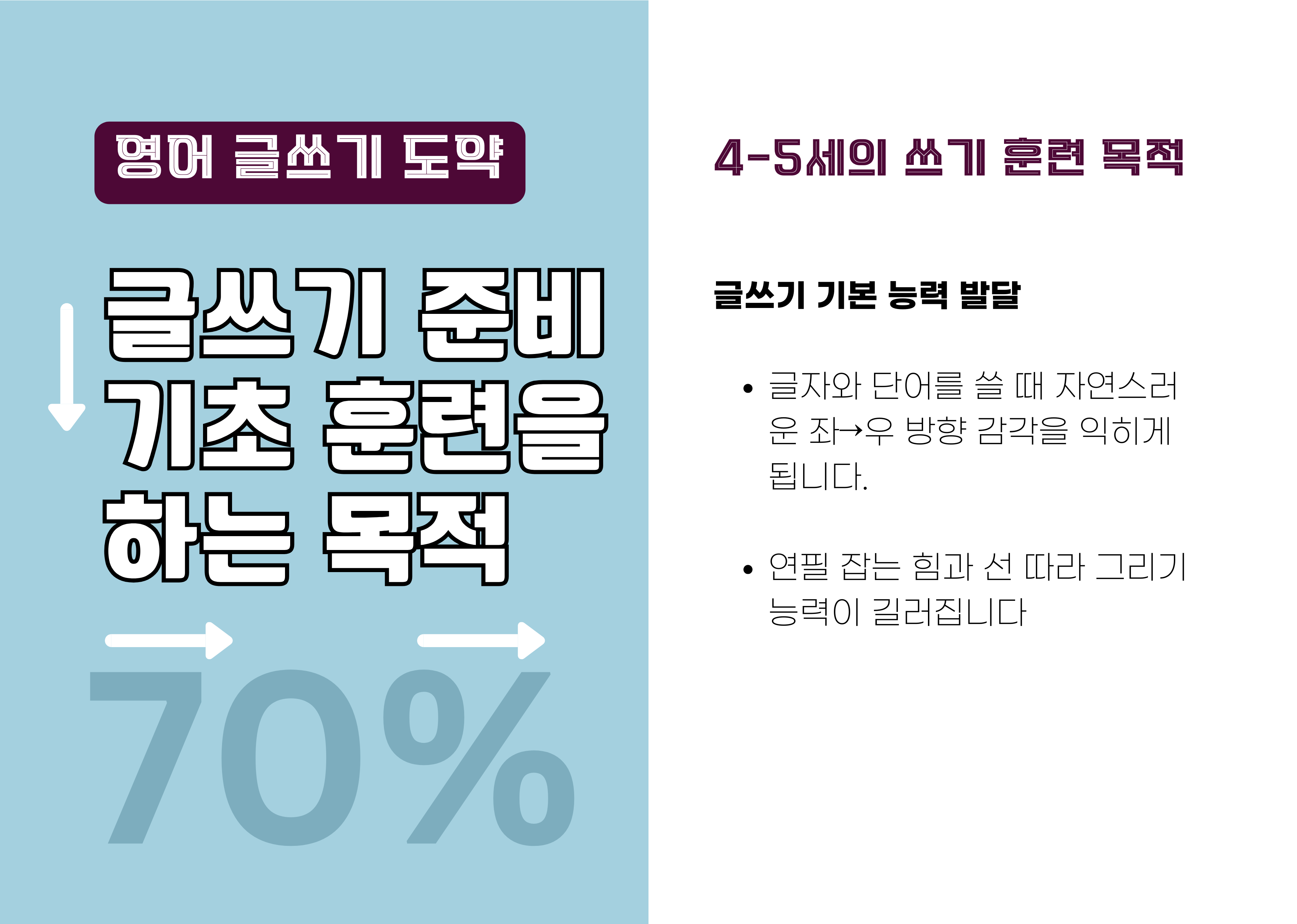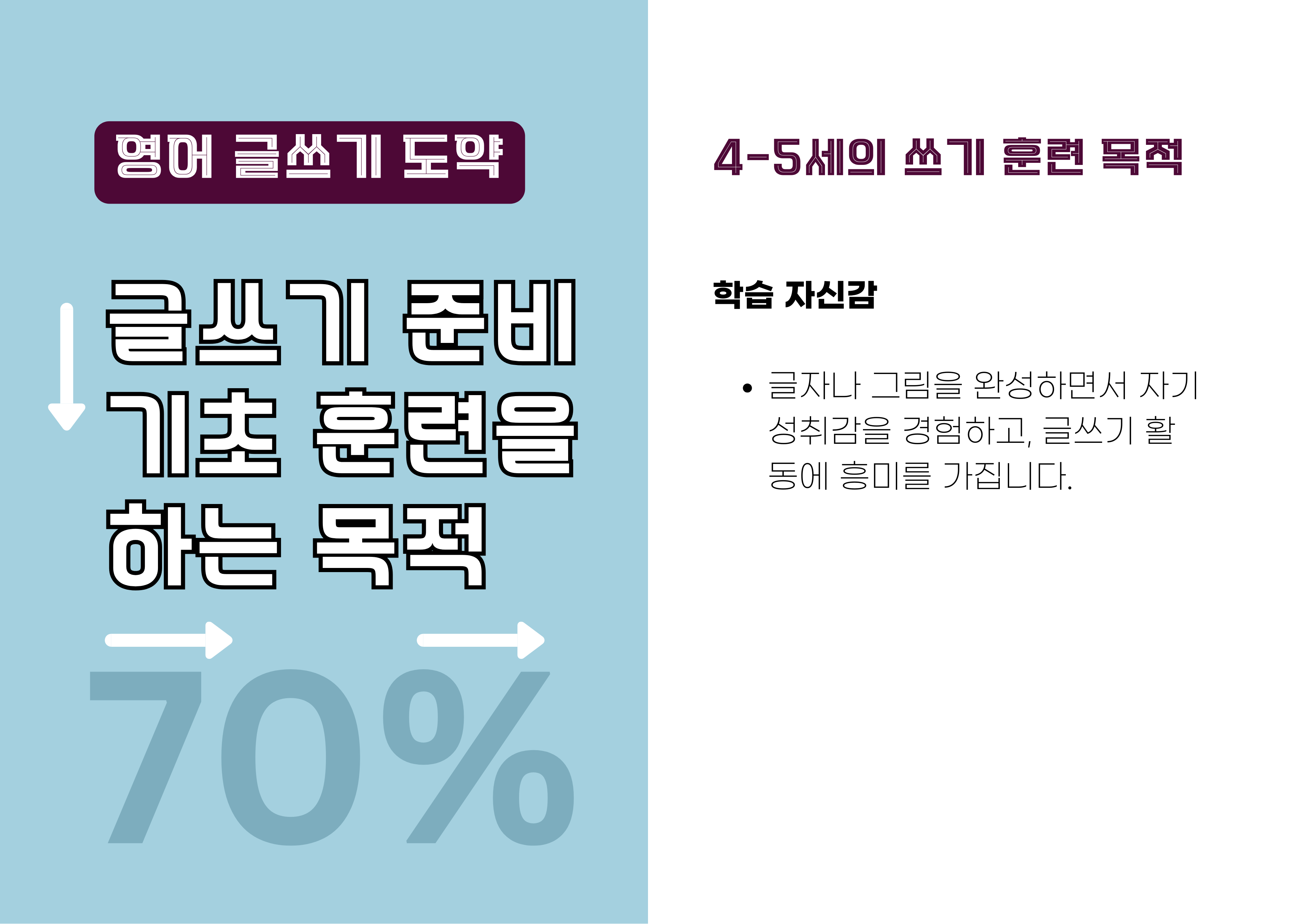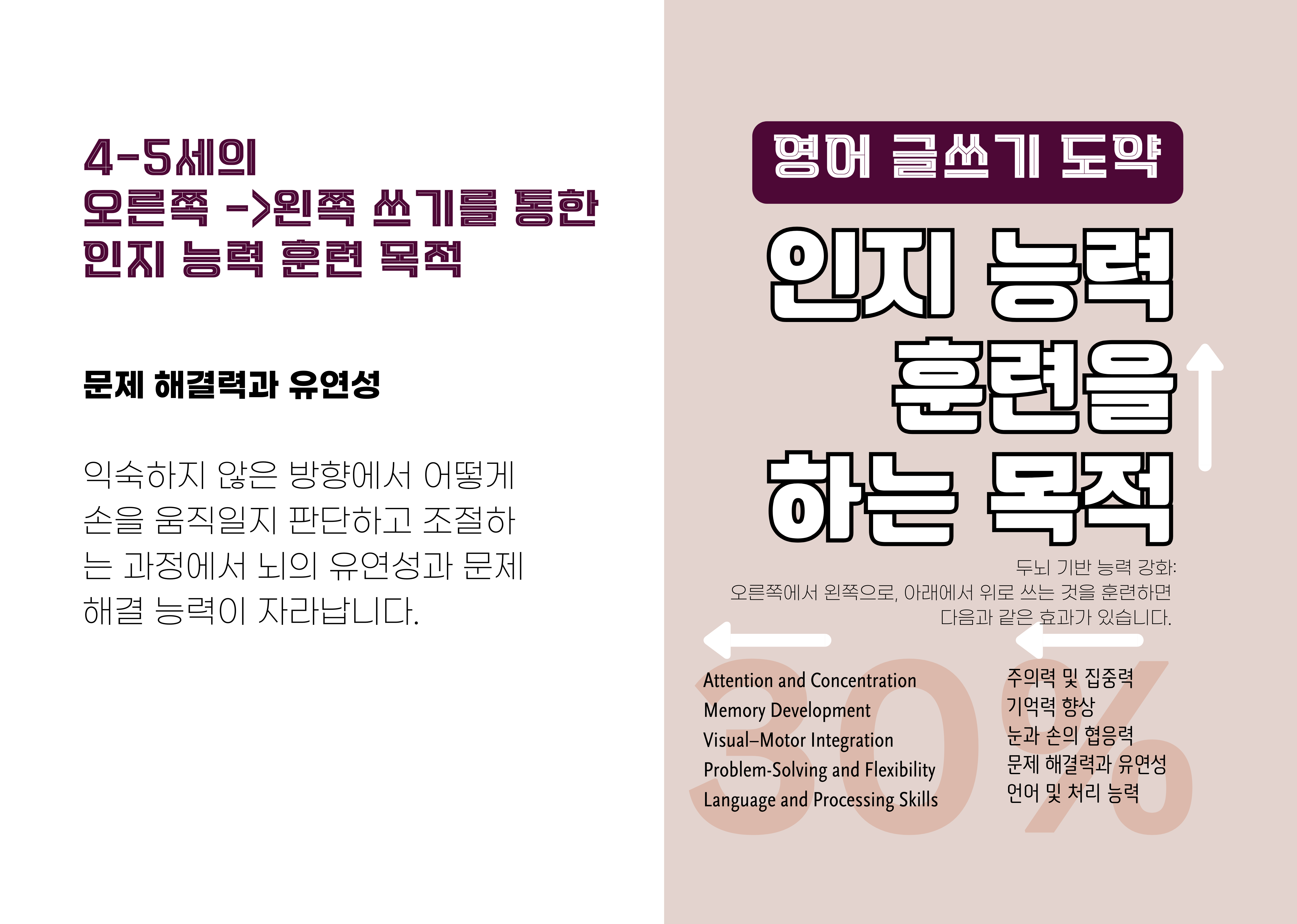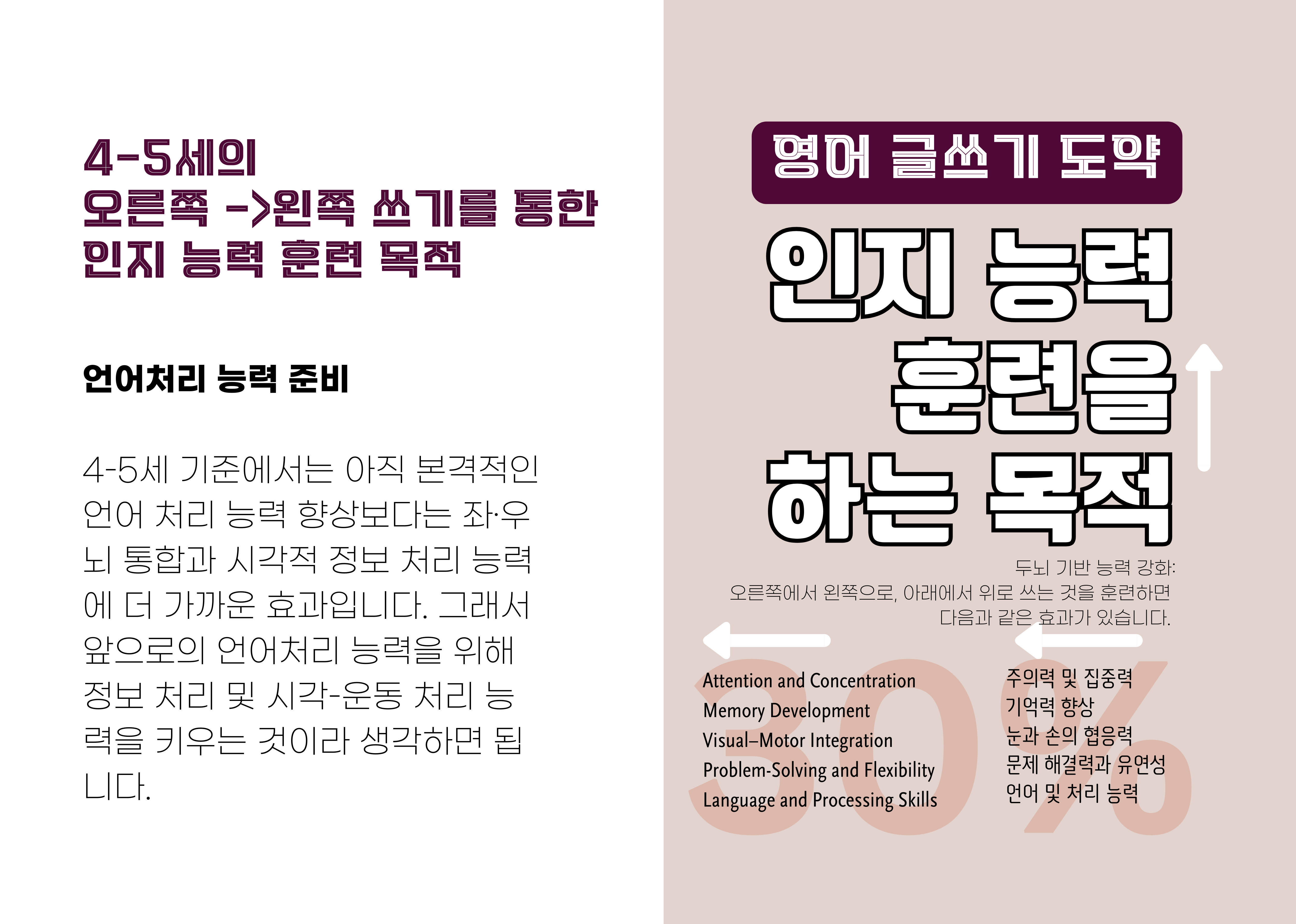 좌뇌 중심 손 운동과 글자 인식 능력이 아직 초기 단계입니다. 오른쪽→왼쪽 tracing은 손과 눈의 협응, 공간 감각을 더 요구하기 때문에 너무 어렵게 느끼면 흥미 저하나 좌절감이 생길 수 있어요. 그래서 이 워크북에서는 70%의 분량으로 왼쪽→오른쪽 tracing을 기본으로 시키고 나머지 30%의 분량을 오른쪽→왼쪽 연습을 넣었습니다. 놀이처럼 챌린지로 진행하면 부담이 덜할거예요. 꼭 넣은 이유는 시선과 손의 반대 움직임을 조절하면서 두 뇌를 동시에 사용하게 되어 상당한 집중력을 필요로 하고 창의력 향상의 기반이 될 수 있어서예요.