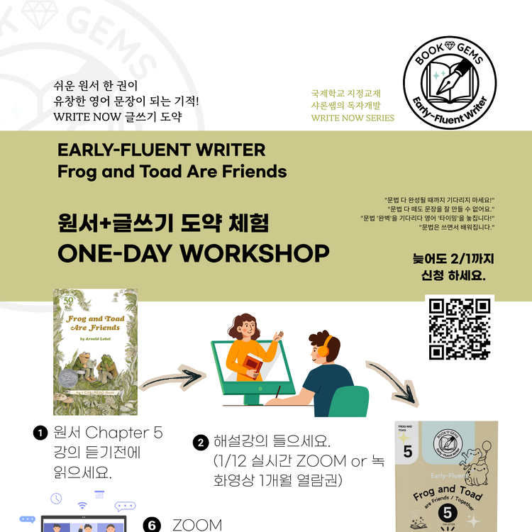 🐸 1회 워크샵 이후 일정은? 수업 받고 싶으면 어떻게? 초5-중2 학생은 개구리 5권수업부터 최대 2개월간 수업 등록 가능합니다. 겨울방학때 초등생 영어 문법/글쓰기/발화를 강화하고 싶다면 딱 좋을 것 같습니다. 성인인… 진짜 원하면 만들어드릴 수도 있어요 8회수업으로. 하지만 충분히 독학 가능하실거라 믿어요.